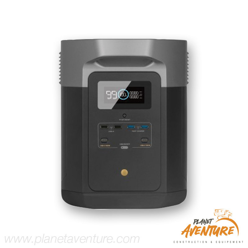 Station d'énergie portable au Lithium NCM ECOFLOW DELTA Max (2000), parfait pour utiliser en toute autonomie les appareils les plus énergivores comme une climatisation, un micro-onde, un petit lave-linge, etc...Capacité de 2 016Wh (équivalent à une batterie 12V de 168Ah) avec convertisseur intégré de 2 400W en continu! Équipé d'un grand écran LCD pour visualiser facilement et en temps réel l'autonomie restante, la consommation ou la puissance de charge. Produit compatible en connexion bluetooth via l'application ECOFLOW disponible gratuitement sur Android et IOS Dispose de nombreux ports pour pouvoir connecter tous vos appareils: 4 prises de sortie CA 230V de 2 400W au total 2 ports USB-A 5V-2.4A 2 ports USB-A charge rapide de 18W 2 ports USB-C de 100W max 1 prise de sortie allume-cigare 12.6V/10A 2 ports de sortie DC5521 12.6/3A 1 port de charge de 12/24V-8A pour vous charger directement sur les prises du véhicule Charge ultra-rapide grâce à la technologie X-STREAM qui permet de recharger la station d'énergie de 0à 80% en moins d'une heure. Peut se recharger directement sur prise 230V (2 000W max), sur prise 12V ou grâce à des panneaux solaires jusqu'à 800W! Régulateur type MPPT intégré Technologie sûre et sécurisée avec BMS intégré qui protège l'appareil contre les surtensions, sous-tensions, surcharges, courts-circuits et surintensités Système très léger et portatif qui peut vous accompagner partout où vous en avez besoin. Livré avec câble de recharge 230V et manuel d'utilisation Durée de vie de 800 cycles Produit garanti 3 ans
